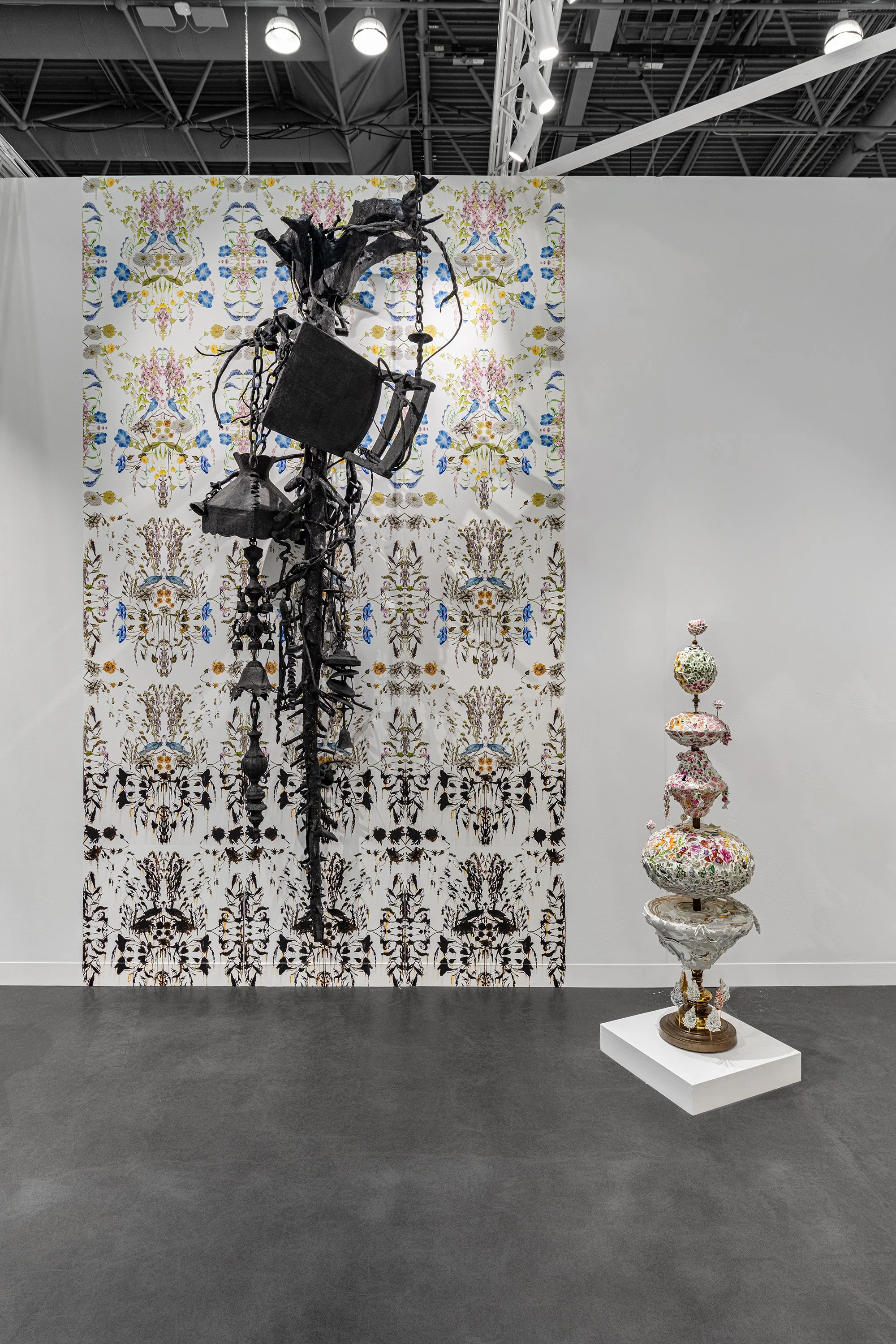 Our booth captures her complex affinity to the South with a breathtaking installation of both hand-cut vintage and artist-designed vinyl wallpaper draped around casts of household objects. Her wallpaper subtly depicts the degradation of flowers and birds from her Southern garden as an ode to the effects of regional flooding and climate change. On plinths and hung on her wallpaper, we’ll show Elizabeth’s reconstructed sconces and porcelain where she has laboriously extracted all of the telltale China patterns that confer value. These meticulous, lace-like pieces include Confederate commemorative plates with all of the offending generals removed, reduced to dust, and collected in glass vials. You can’t erase history, but art can induce nuanced conversations about it.” -K Contemporary