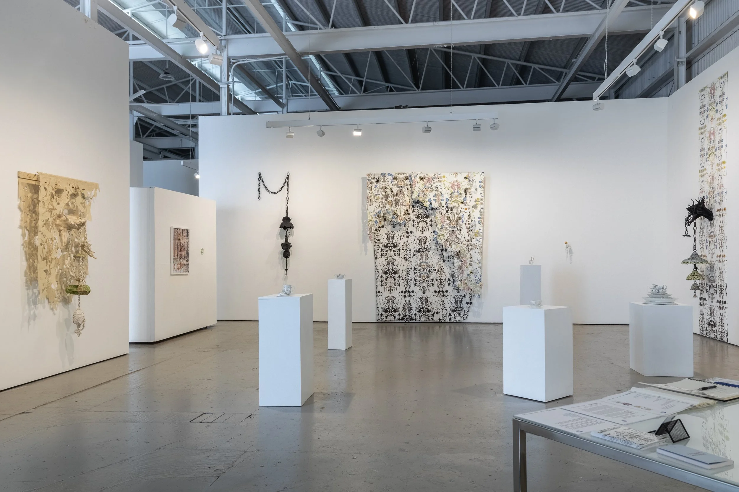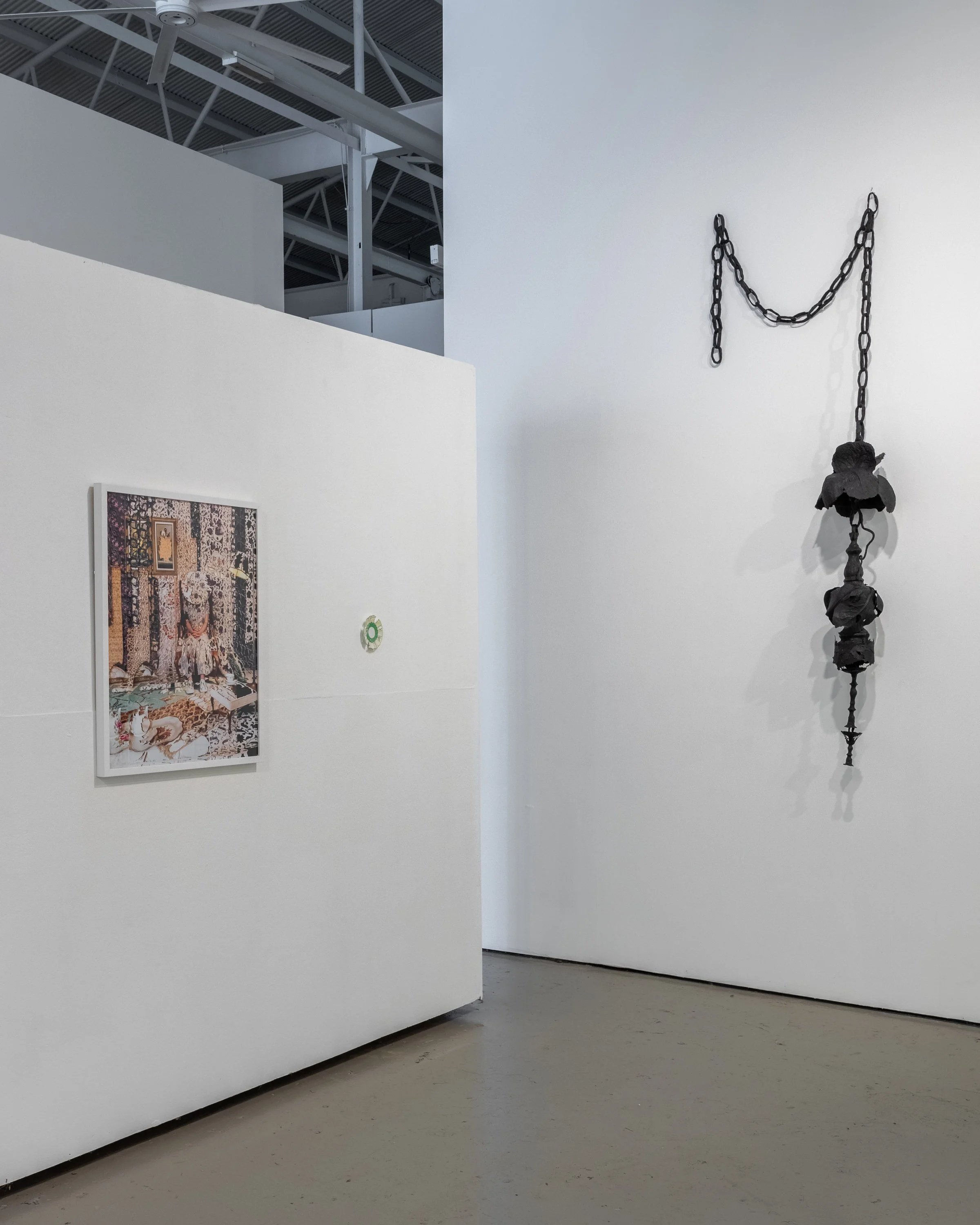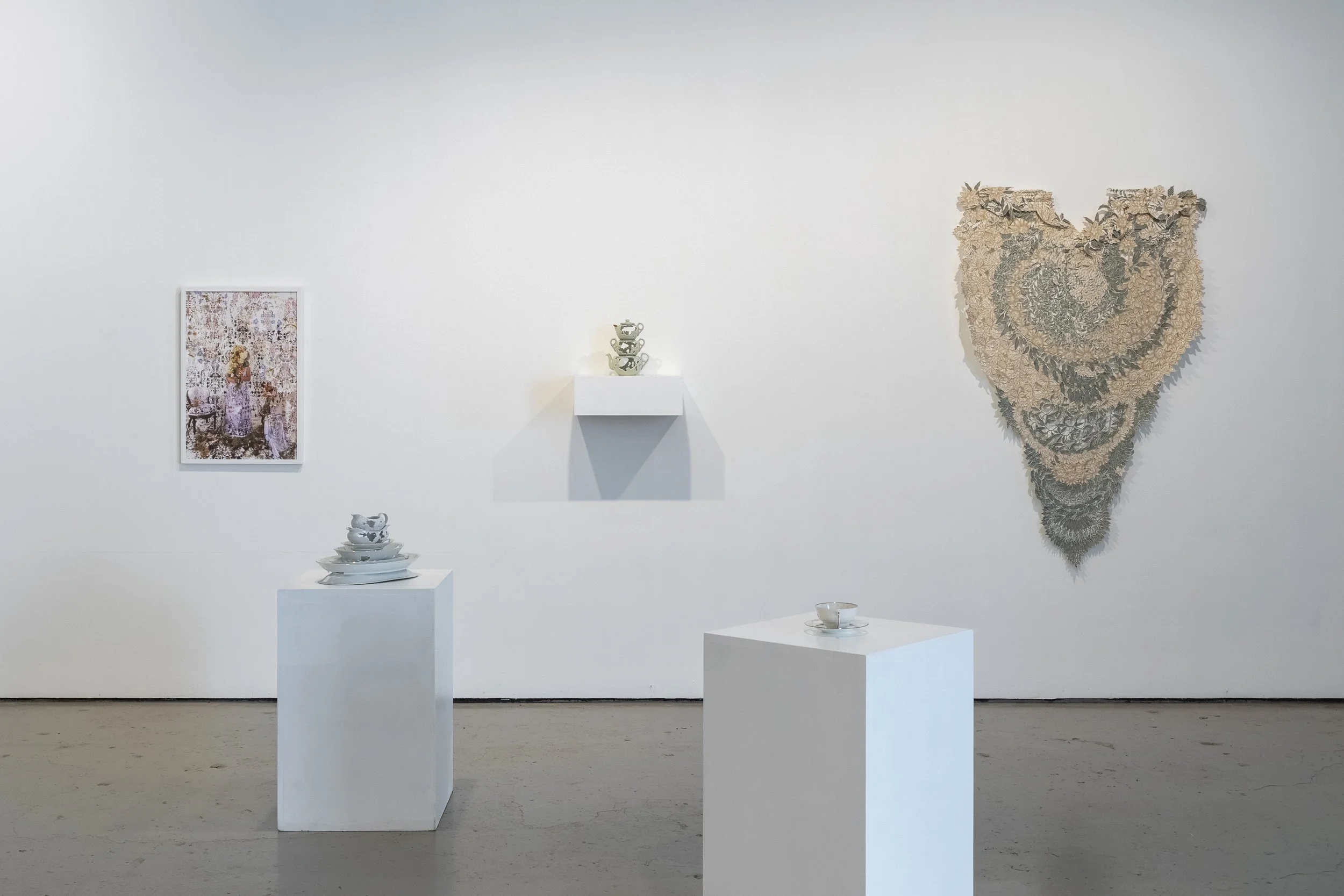 The title of the exhibition, taken from a poem by Mary Oliver, describes the feeling of relief when a storm is visible, but distant. Like the poem, there is evidence of time passing and changing the contents of this show: figures sit idly in images while they dissolve, porcelain tableware is worn down into delicate shells, floral decor is dying before one’s eyes. Alexander blends scavenged domestic forms and floral decor with cast storm debris to imbue objects of order and comfort with the unpredictability and slow evolution of the natural world. Within these 'beautiful disasters' she works to bring forth the increasing vulnerability within our surroundings often hidden among the pleasantries. Her work envisions the humanity embedded within our surroundings and uncovers the porousness of our walls and the interconnectivity we often forget (or ignore) is there." -Tracey Morgan Gallery